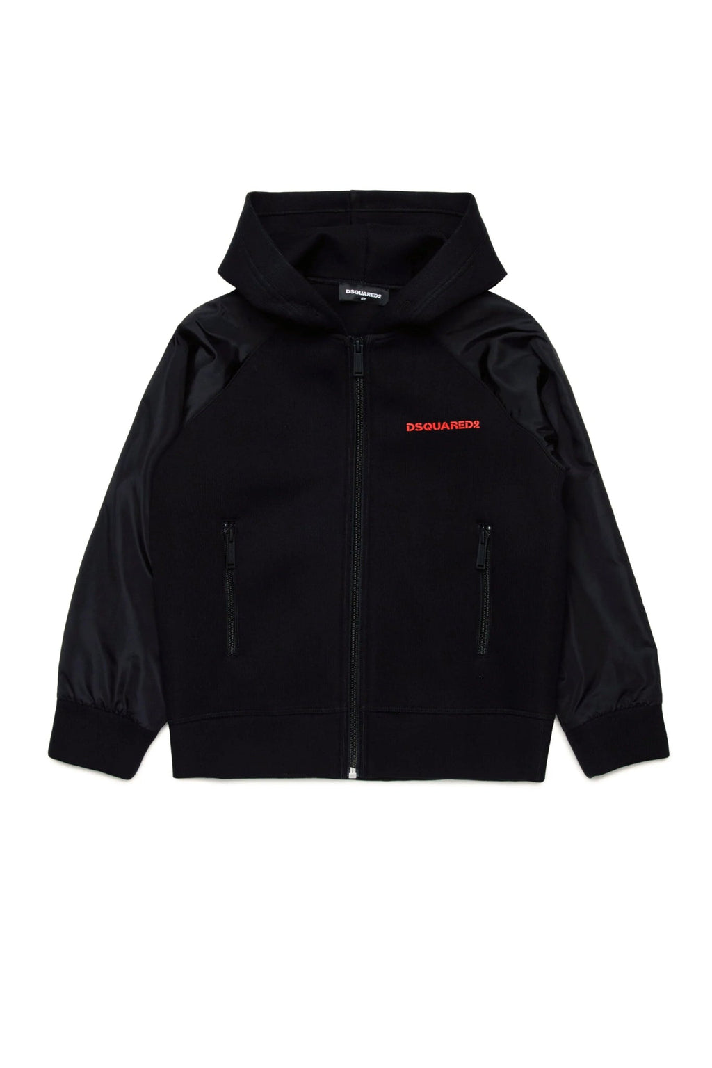 Felpa full zip con cappuccio. Realizzata in neoprene a costine con maniche in nylon lucido leggermente imbottite. Logo Dsquared2 gommato sul davanti lato cuore. Tasche con cerniera anteriori. Un'opzione casual facile da abbinare.