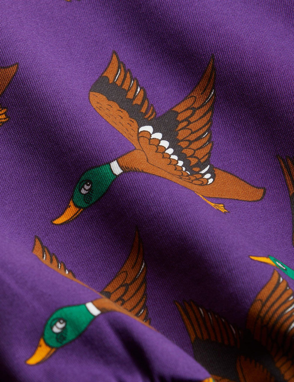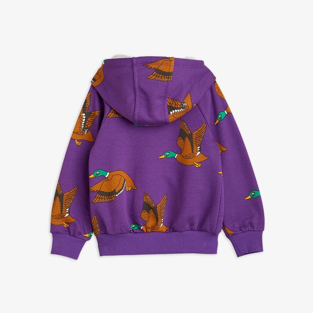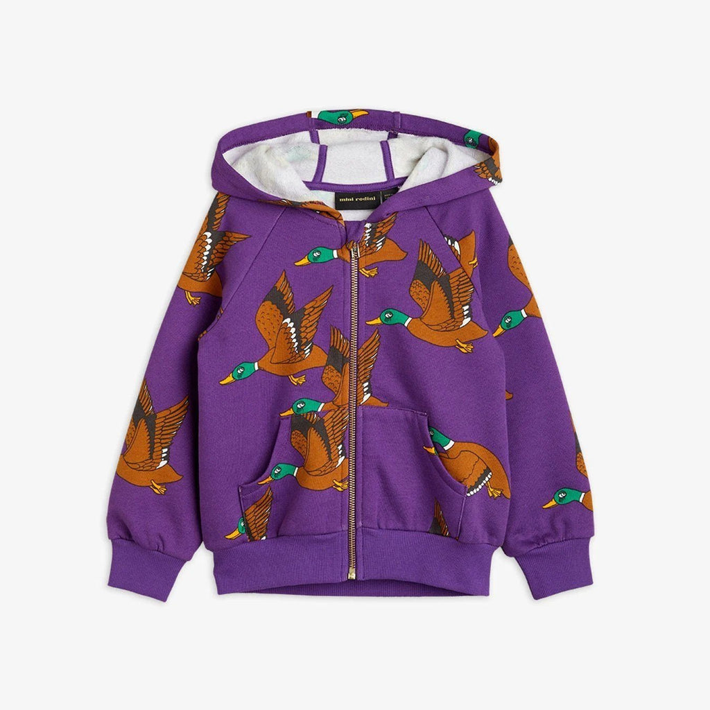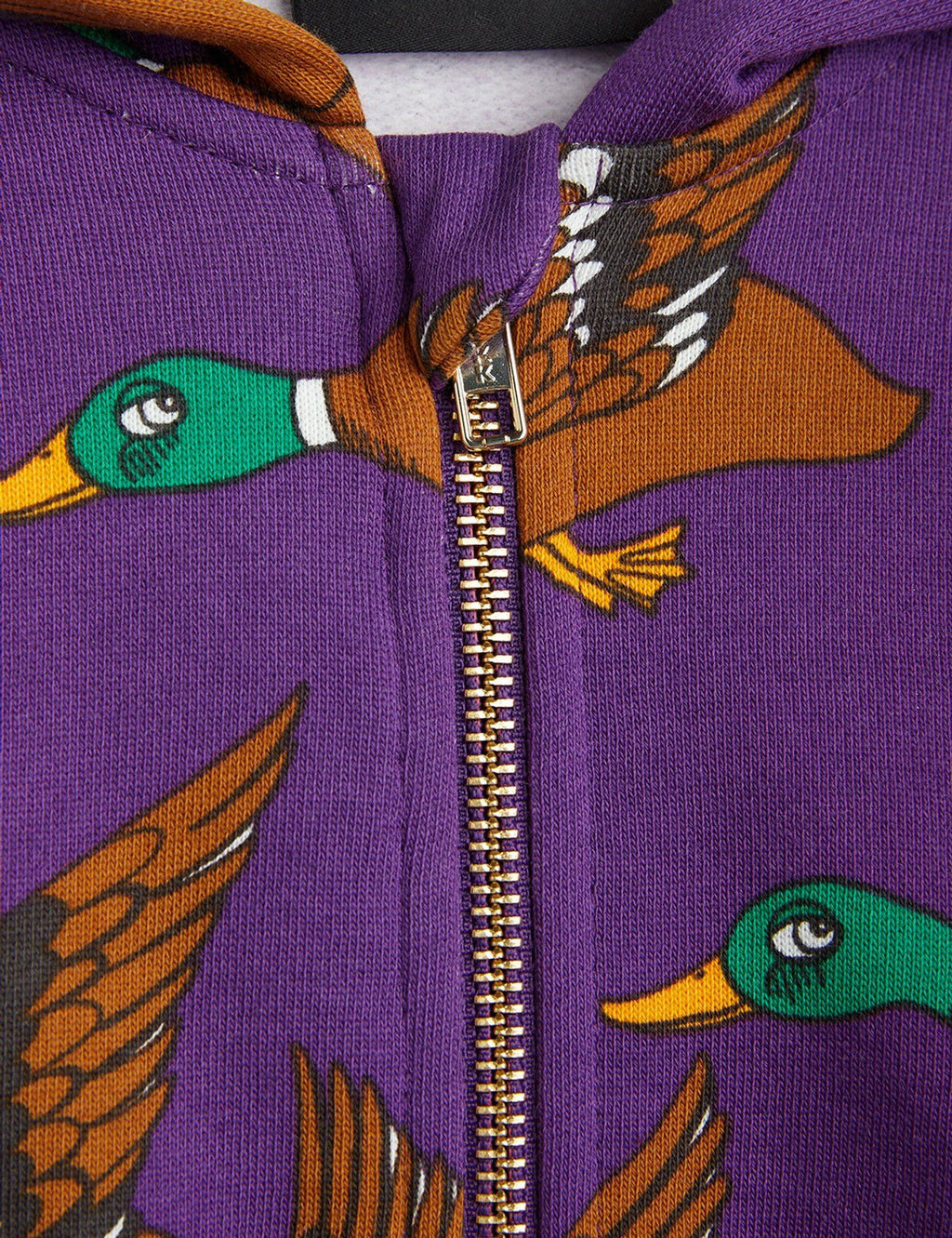 Felpa con cappuccio e zip con stampa Ducks all over realizzata in 100% cotone biologico certificato GOTS. La felpa con cappuccio è progettata con una cerniera in metallo dorato, due tasche nella parte anteriore e polsini e orlo inferiore a coste